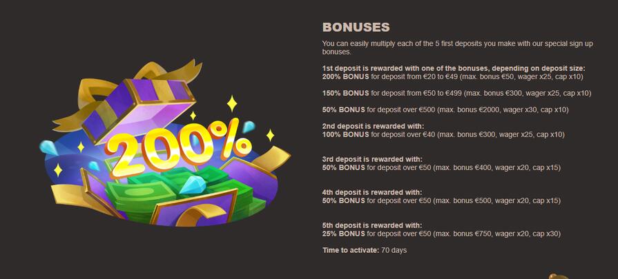 - Депозит от 10€. Игрок получает 200% от суммы в качестве бонуса, но не больше 25€. Полученные денежные средства требуется отыграть с вейджером x25. Максимальный размер выигрыша во время отыгрыша составляет x10.