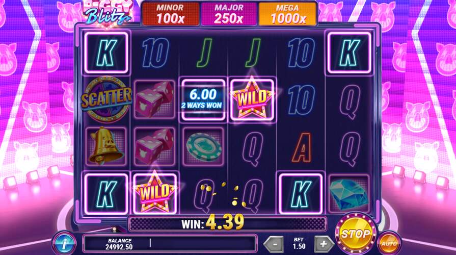 В Piggy Blitz реализована средняя волатильность. Поэтому совпадения тут способны давать как большие, так и маленькие выигрыши. Игровое поле выполнено в формате 6*4 (четыре ряда и шесть барабанов).